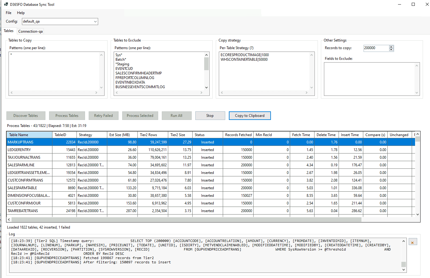 The main idea is to make the last X records (ordered by RecId) the same between Tier2 and AxDB. E.g. A typical dynamics implementation has ~2000 tables with the data, around 200 tables are transactional tables that exceed 100k records, so if we sync last 100k records per table we can get a compact DB with the most of the base data and recent transactional data.