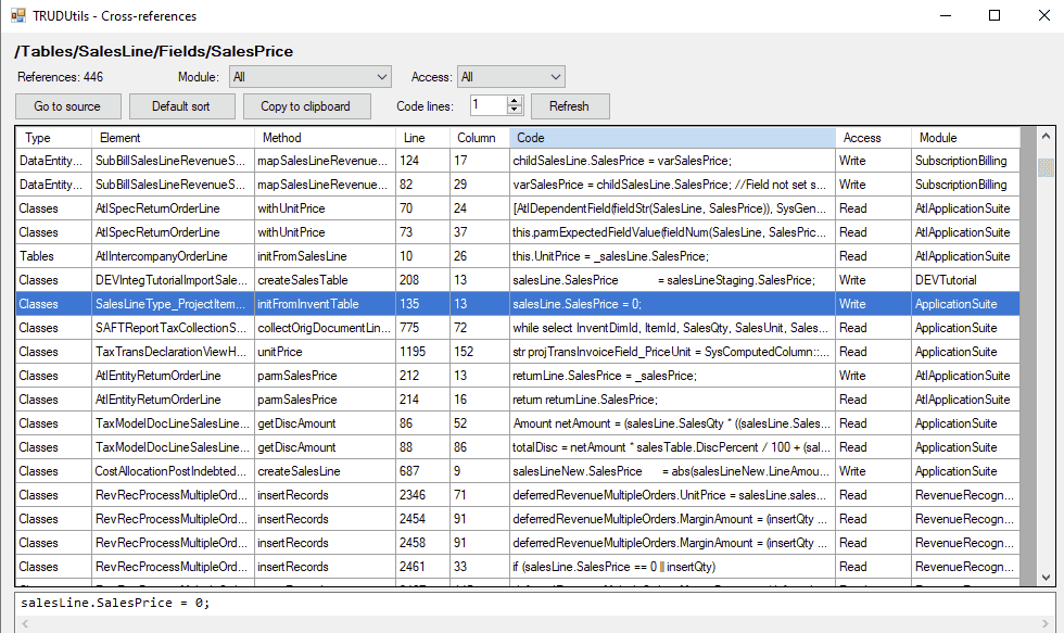 I tested it on several popular fields, such as SalesLine.SalesPrice and it works great. The tool also displays the actual code line (configurable - one or several lines of context), so you can visually confirm what the code does.