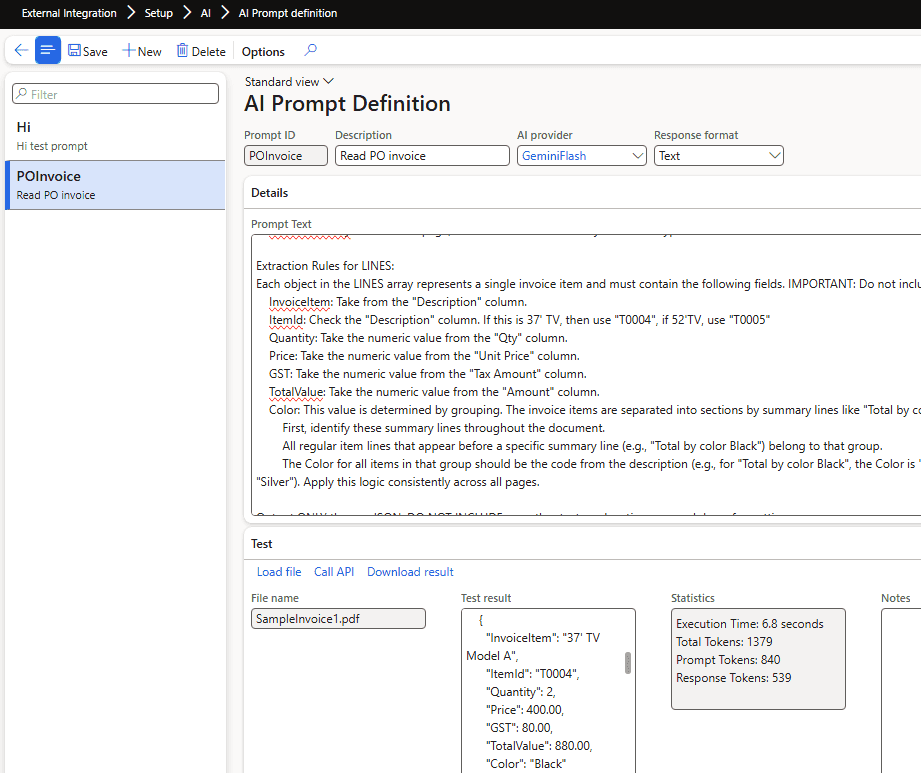 We currently live in an AI world, and many modern models support file inputs. The idea was to use an AI model to read the document and output it as a JSON structure. Then, use the External Integration Framework (which can work with JSON data) to create the required D365FO documents.