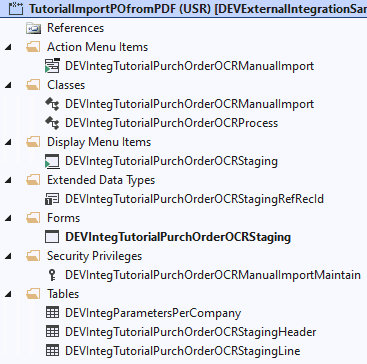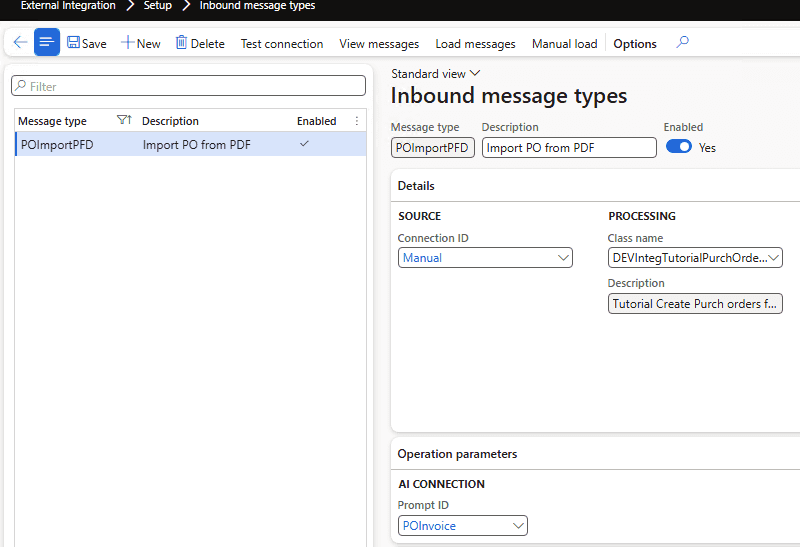 To setup processing, we need to create a new Inbound message type with a processing class DEVIntegTutorialPurchOrderOCRProcess which reads the JSON from the AI call and creates a purchase order based on it.