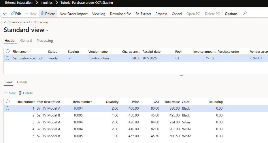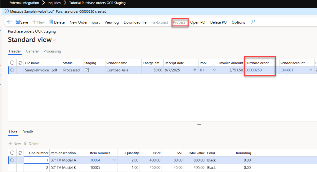 After validation, select Process to create a purchase order. The purchase order is created, and the staging data reference is updated (so you can always trace an individual order to the original PDF file).