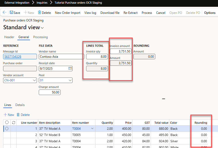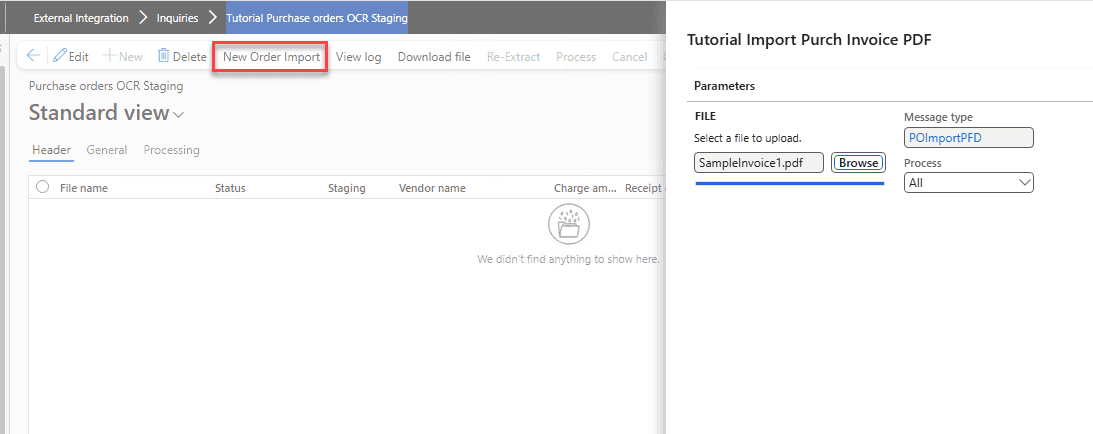 After specifying all settings, we can test the import. Open Tutorial Purchase orders OCR Staging and select New order import.