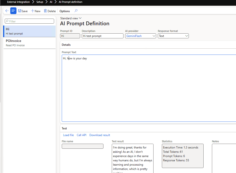 First, validate that the connection works by sending a simple “Hi” prompt. The Call API button runs the prompt, displays the response, and shows related statistics.
