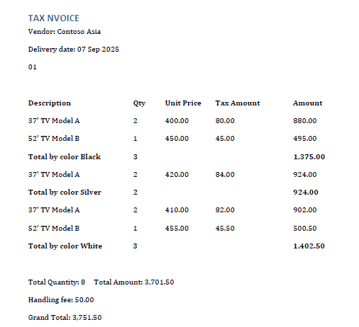 Color: This value is determined by grouping. The invoice items are separated into sections by summary lines like "Total by color Black", "Total by color Silver".